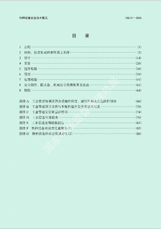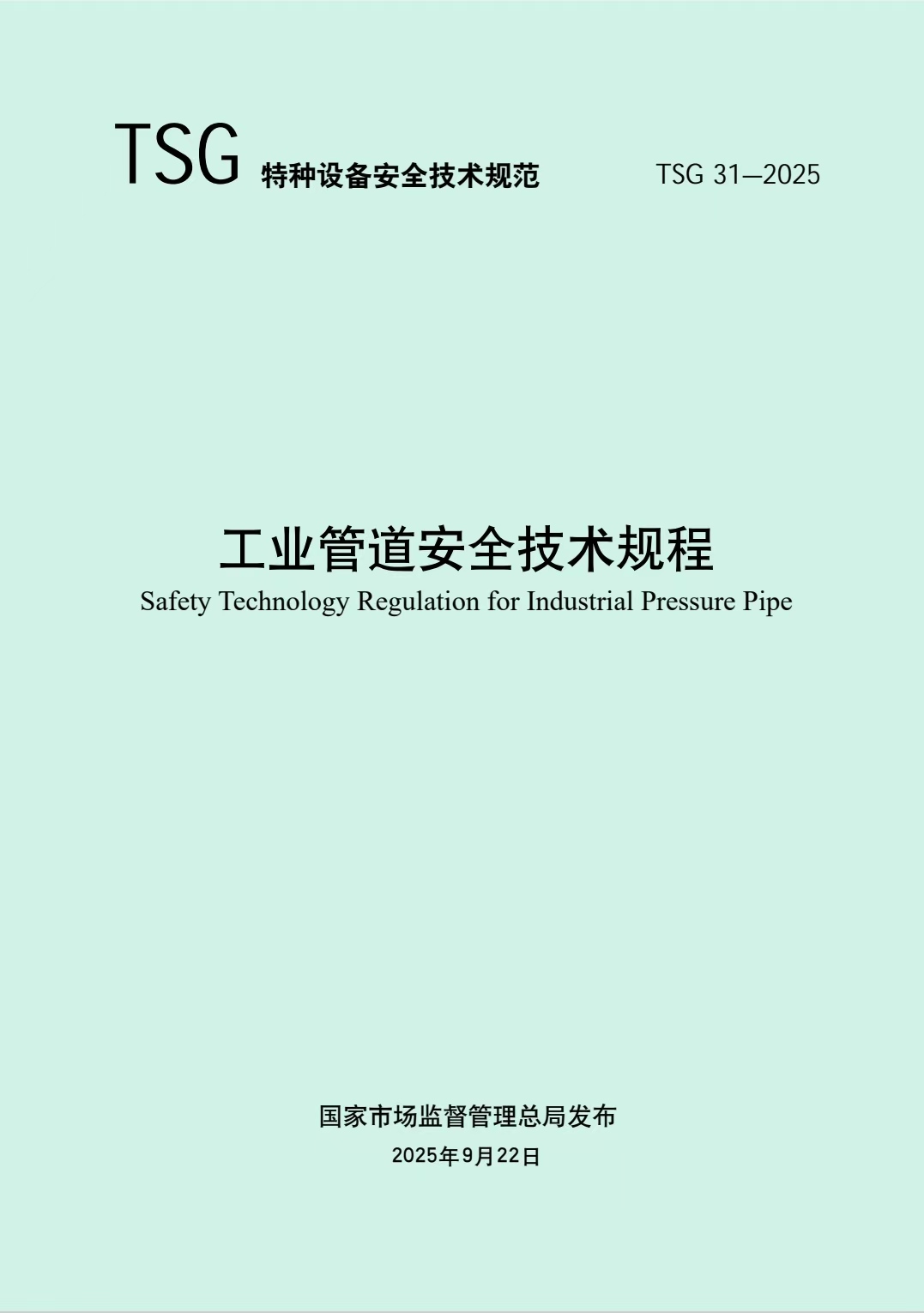 根据《中华人民共和国特种设备安全法》规定,结合压力管道安全状况,市场监管总局对《压力管道安全技术监察规程—工业管道》(TSG D0001—2009)、《压力管道定期检验规则—工业管道》(TSG D7005—2018)等安全技术规范进行整合修订,形成《工业管道安全技术规程》(TSG 31—2025,以下简称规程),现予批准发布,自2026年1月1日起施行。现就有关事项公告如下。